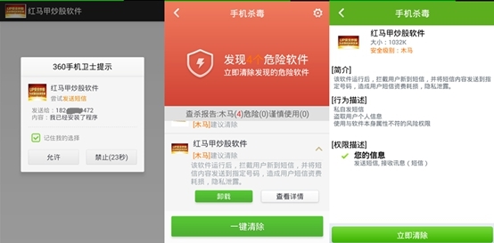 另一款木马篡改了“红马甲炒股软件”,不仅会拦截手机用户新到短信,并将短信内容发送到指定号码,造成中招用户话费损失,并且泄露个人信息。不法分子在掌握了中招用户的通讯录和相关信息后,就可以扩大作恶范围,甚至可以有针对性的进行定向诈骗,对更多人的手机和财产安全造成威胁。